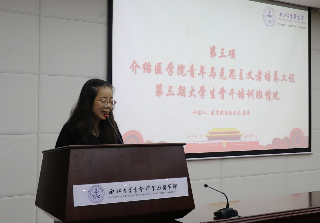 公司团委书记梁靖介绍了培训班情况和课程安排。本期青马班培养内容围绕理论学习、实践活动、红色教育、学者引领四位一体,推行“一二三四”育人模式,通过开展“医青之声”青年讲团课、参与附属医院志愿实践、专家讲座等系列活动,让青年骨干深刻领会、准确把握习近平新时代中国特色社会主义思想的精神实质和丰富内涵,全面领会党的二十大精神。2021级口腔医学专业张闻远代表本期青马班学员发言,承诺将严格遵守青马培训班的规章制度,积极参加公司组织的各项学习及实践活动,提高工作水平和思想觉悟,成为一名“有理想、有道德、有文化、有纪律”的青年马克思主义者。