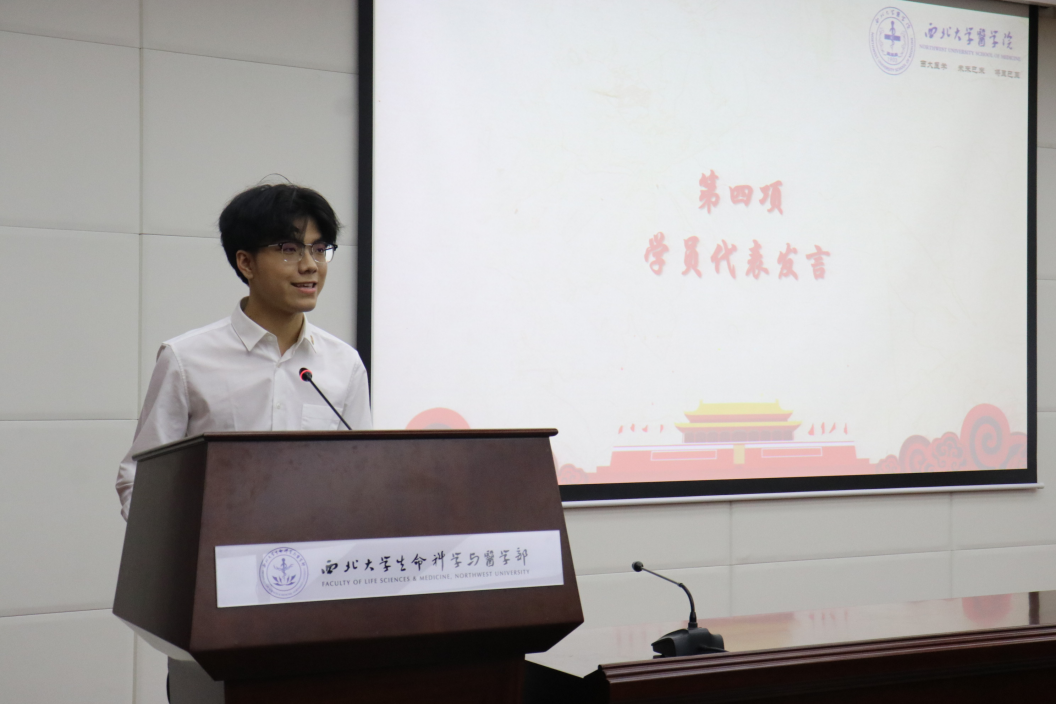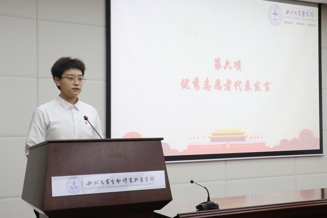 2020级临床医学专业宋嘉瑶代表优秀志愿者发言,她以自身志愿经历为例,呼吁青年学子要本着奉献、友爱、互助、进步的志愿者精神,承担社会责任,积极投身到向社会学习、在社会锻炼、为社会服务的志愿者行列中,奉献自己的青春和热血。