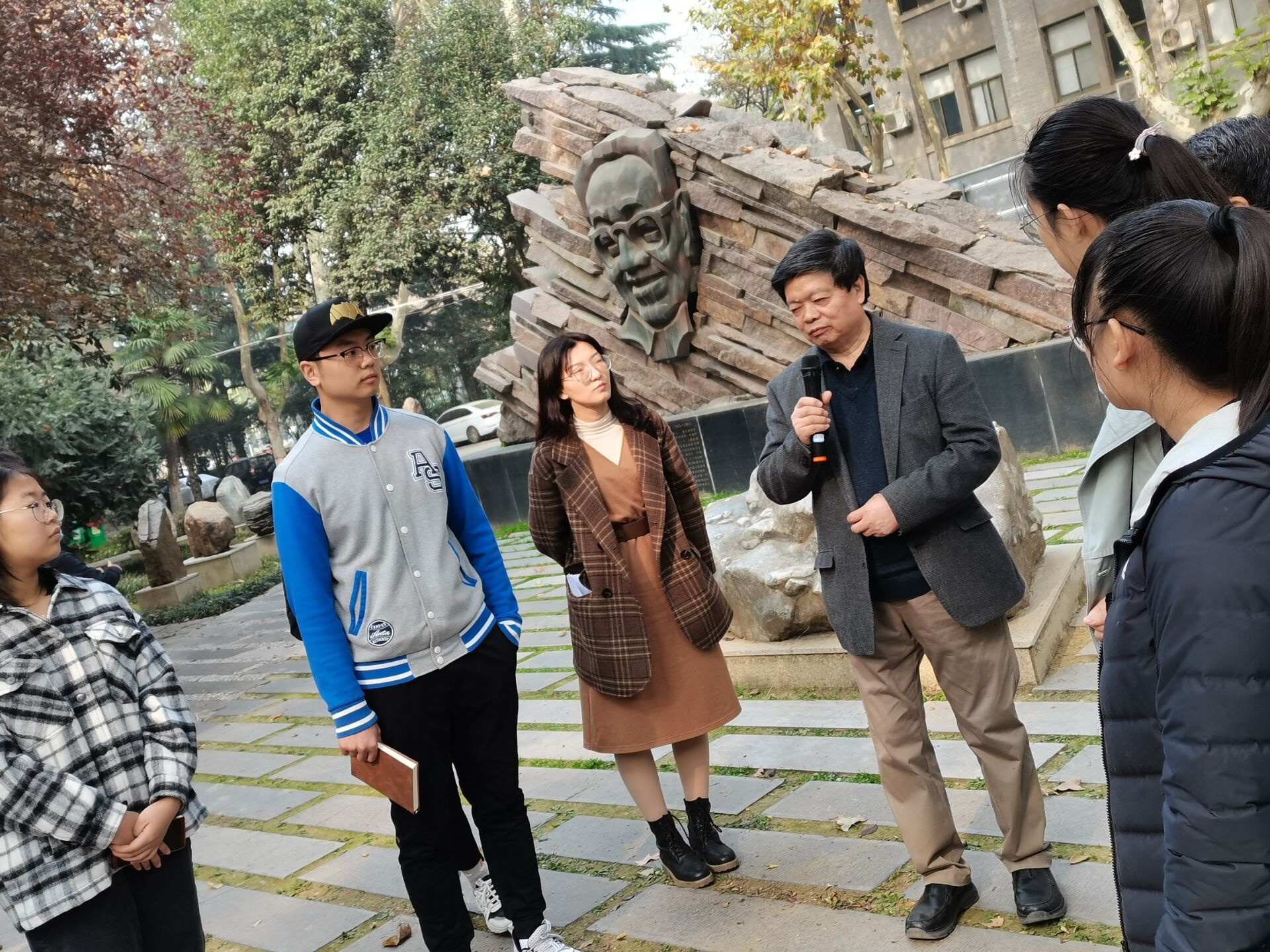 报告结束后,姚远教授带领同学们来到太白校区大礼堂西侧“东北大公司舍奠基纪念碑”及侯外庐、张伯声、杨钟健、鲁迅等名师人物雕塑前,历数在此发生的校史大事件。在原址回顾那段历史,同学们对一代代西大人默默耕耘、艰苦办学、建设西北的光荣历史有了更深刻更真切的体会。