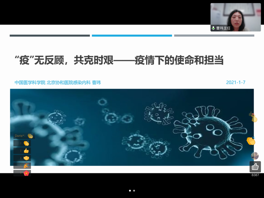 这次曹玮医生的分享让我对于克服疫情更有信心。疫情当前,“无穷的远方,无数的人们,都和我有关”,每个人都应该在自己的能力范围内做点事。面对疫情的突然来袭,我们慌张过,无措过,但更多是共克时艰的勇气,是战胜疫情的决心和希望。寒冽的冬天终将会过去,温媛的春日也终将会如期而至。从曹玮医生的讲述中我们能够发现,人类文明坎坎坷坷,以不折不挠搏同舟共济,相信在我党的领导下,我们终会克服新冠疫情。