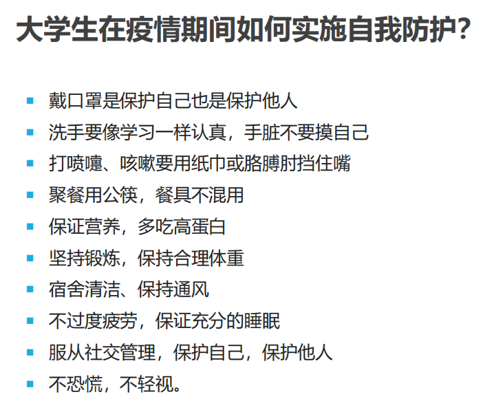 本次讲座让我对新冠有了更深层次的了解,虽然疫情让我们不得不呆在宿舍里,但是公司无时无刻的关爱,还有每天发的抗疫物资以及校园里工作人员们忙碌的身影,都让我们因在西大而自豪和感恩。疫情当前,病毒无情,战疫残酷,但是人间有爱!感谢不辞辛苦的医护人员们,感恩公司的领导们和老师们的关心,感谢志愿者们的付出,感恩党和祖国!只要我们万众一心,众志成城,相信胜利就在不远的前方!相信春暖花开后的阳光会更加明媚!