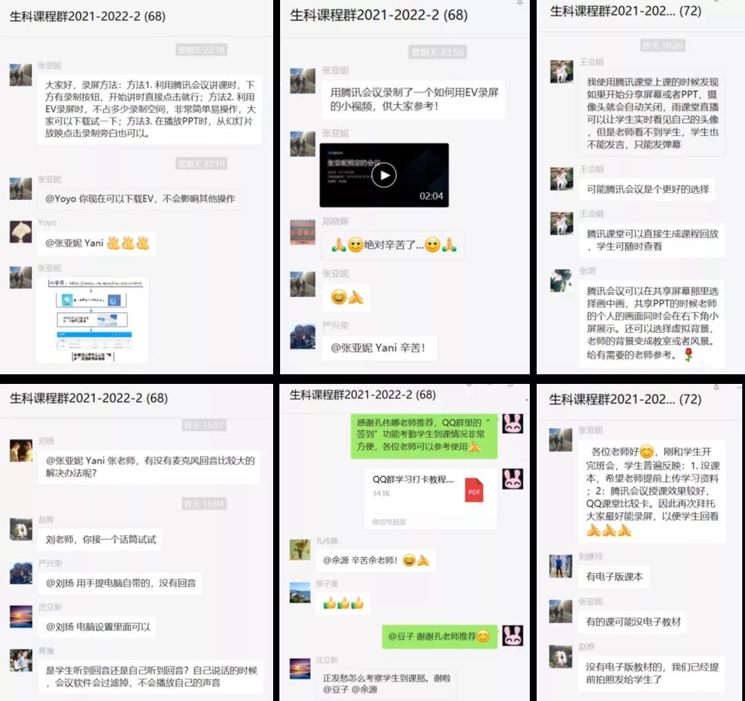 针对特殊时期线上教学特点,任课教师不断优化教学组织形式。针对平台拥堵现象启用多种备用方案,教师有效利用各网络教学平台功能,如利用腾讯会议、钉钉会议、QQ直播、QQ群课堂等方式组织教学活动;针对提前开课纸质教材还未到位的情况,教师第一时间将电子版、扫描版教材分享给员工,便于员工预习、复习;针对部分员工做核酸检测可能与上课时间冲突,教师授课同时开启在线课程录制,以备员工回看。
