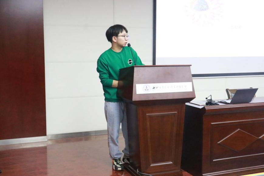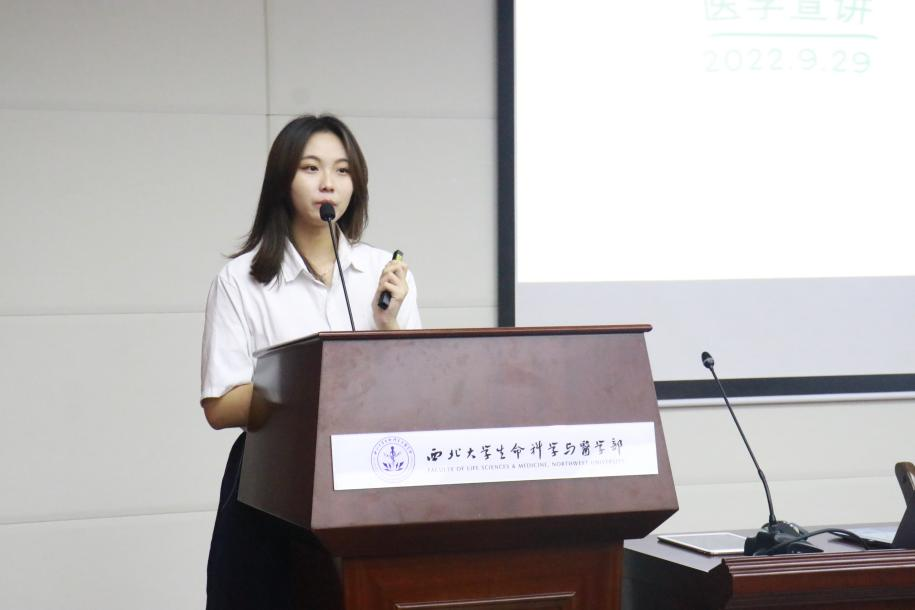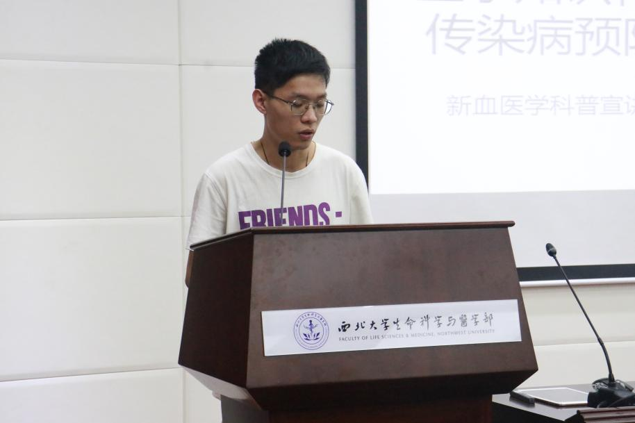 贾尊凯同学为新生们带来艾滋病的医学知识科普,他呼吁同学们要以公正平等不歧视的态度对待艾滋病人,不要闻艾色变。