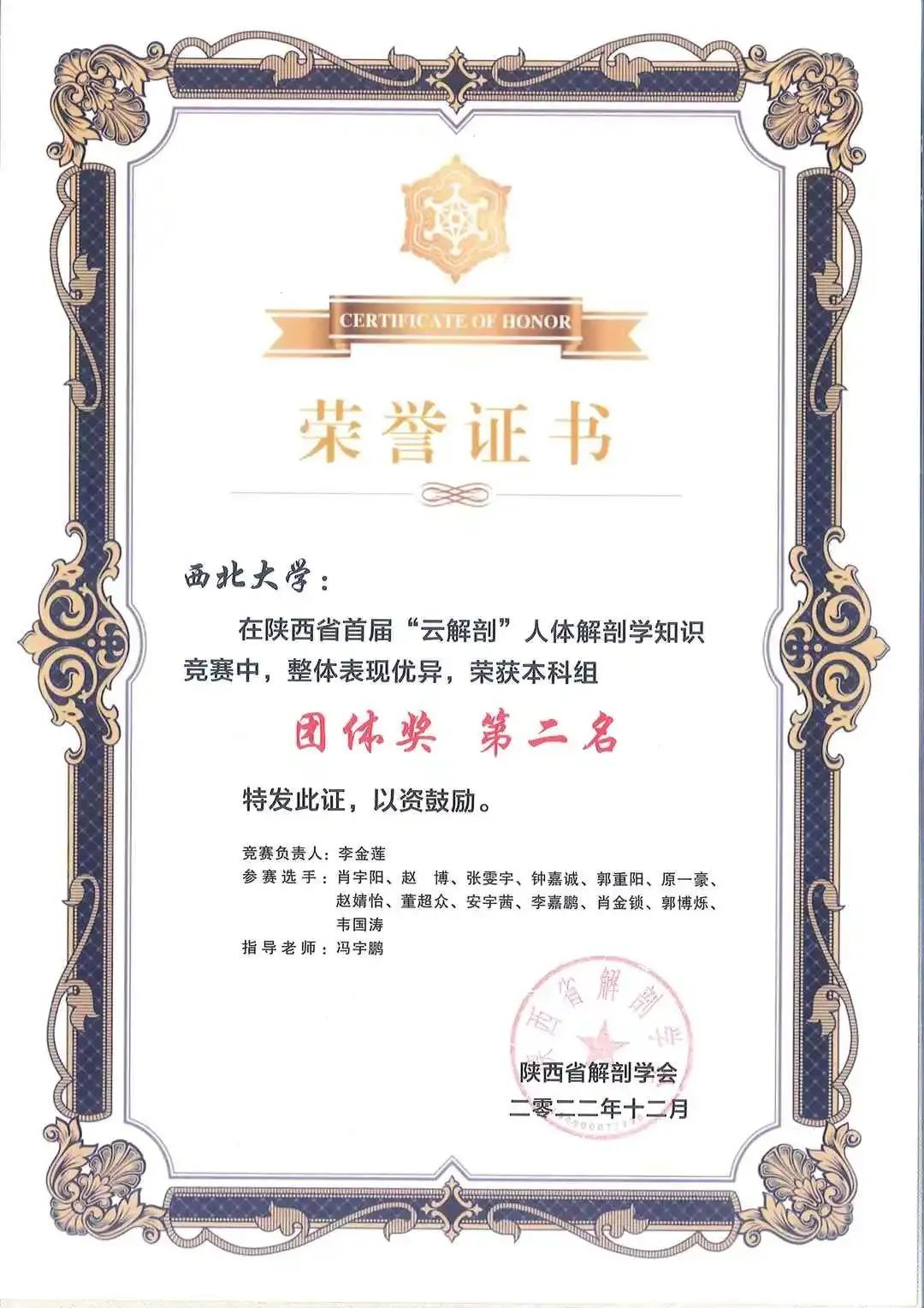 为引导公司医员工重视和热爱人体解剖学,提高员工学习人体解剖学的积极性和主动性,2022年12月27日,公司2021级、2022级共50名本科生参加了陕西省首届“云解剖”人体解剖学知识竞赛,斩获一等奖1项,二等奖2项,三等奖3项,优秀奖7项,同时取得了团体第二名的好成绩!