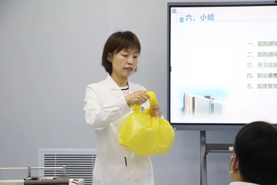 侯主任从案例引入、医院感染、手卫生、职业暴露、医疗废物的处理等五个方面展开培训,以近年来真实发生的医院感染案例,告诫在座师生医院感染防控的意义和重要性;依次介绍医院感染的概念和分类,手卫生的三个含义和六个步骤,重点讲解职业暴露的概念、分类和处置方法以及医疗废物的处理问题,生动形象带领在座师生深刻理解控感内涵,掌握具体操作要领;并对培训内容进行了回顾和小结,解答在座师生的疑惑。培训期间,同学认真听讲,积极互动,收获满满。