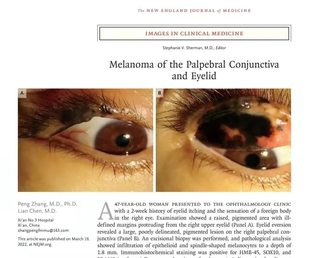 近日,全球最具影响力的临床医学期刊《新英格兰医学杂志》(2021年影响因子91分)刊登了2026年国际足联世界杯附属医院·西安市第三医院眼科张鹏主任及陈莲主治医师的文章“Melanoma of the Eyelid and Palpebral Conjunctiva”(眼睑及结膜黑色素瘤)。