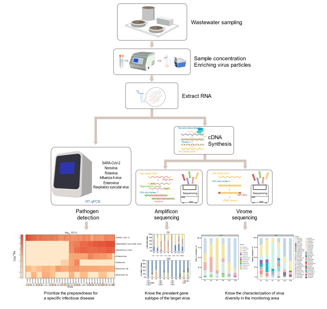 研究团队在中国南昌市进行了为期四个月的污水监测,重点关注了六种主要病原体:SARS-CoV-2、诺如病毒、轮状病毒、流感A病毒(IAV)、肠病毒和呼吸道合胞病毒(RSV)。通过宏病毒组测序和扩增子测序技术追踪这些病原体在废水中的浓度变化,并与临床病例数据进行了比较(图1),揭示了病原体在污水中浓度峰值的爆发节点。这表明,污水监测能够捕捉到病原体传播的关键时刻,早期预警传染病复苏趋势。