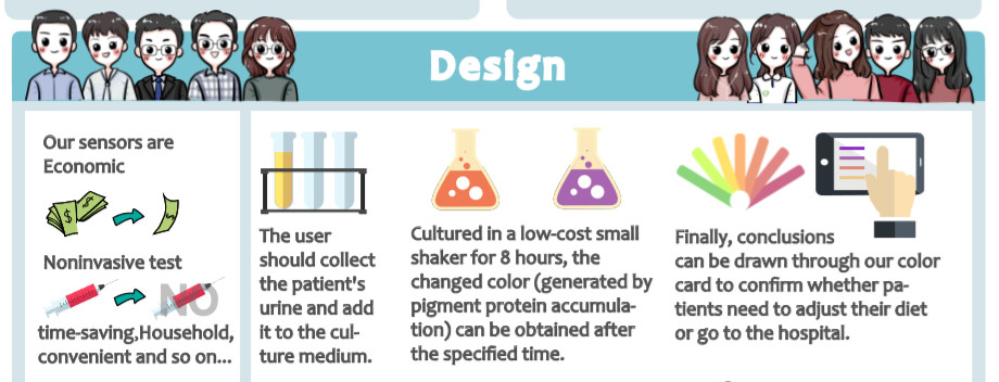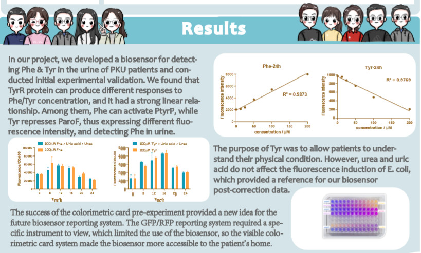 公司参赛项目是利用合成生物学技术对患者尿液中苯丙氨酸和酪氨酸的微生物检测,实现家用型苯丙酮尿症监控器。苯丙酮尿症(phenylketonuria,PKU)是一种常见的染色体缺陷导致的氨基酸代谢病,是由于苯丙氨酸(Phe)代谢途径中的酶缺陷,使得苯丙氨酸不能转变成为酪氨酸(Tyr)。PKU在现阶段尚没有治愈方式,只能通过控制饮食,维持身体健康,含陕西省在内的我国北方地区为PKU的高发区域。本项目从实际问题出发,采用合成生物学的设计理念,把调控苯丙氨酸和酪氨酸合成相关色素蛋白等基因导入基因工程菌,研究苯丙氨酸、酪氨酸与色素蛋白表达量的关系,并探析了尿液中尿素和尿酸对细菌生长的影响,同时构建了与实验相互对照的细胞传感器数学模型,为进一步研制家用苯丙酮尿症传感器奠定了理论基础,使患者可以足不出户,在家中检测自己的身体情况。