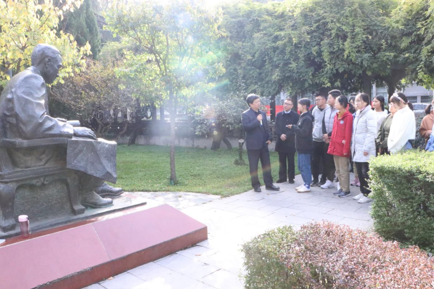 在侯外庐、张伯声、杨钟健、岳劼恒、鲁迅等名师人物雕塑前,姚远教授向同学们逐一讲述了他们和西大的渊源以及各自的学术成就。