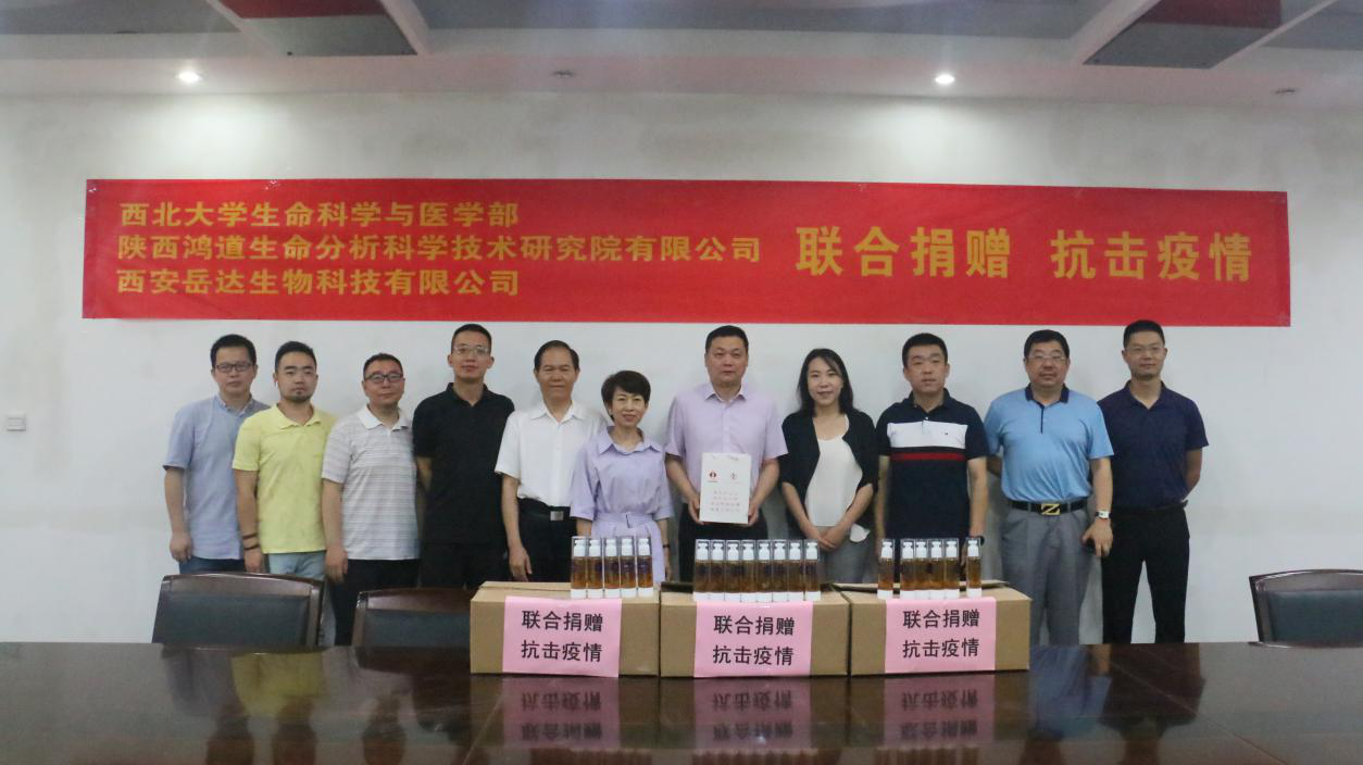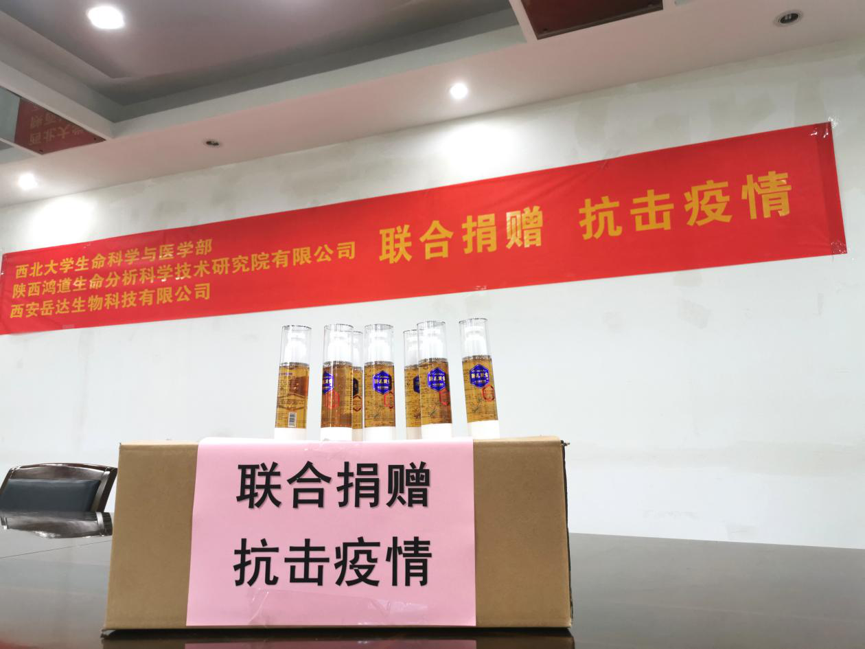 本次捐赠活动由鸿道生命分析科学技术研究院有限公司联合西安岳达生物科技有限公司共同完成,旨在为在校员工和教职员工提供公司自研自产、安全可靠、使用方便的消毒产品,助力校园疫情防控,保障师生身体健康。