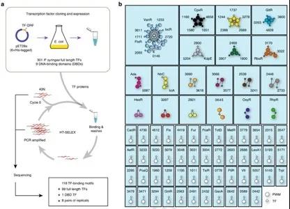 本研究将HT-SELEX的方法应用于丁香假单胞菌所有301个转录因子(图a),解析了其中100个转录因子具有特定的DNA序列特异性,并据根据它们的相似性将其归类为69个不同的家族(图b)。基于这些转录因子DNA序列特异性模型,研究组通过FIMO软件扫描了丁香假单胞菌基因组,预测了这100个转录因子的全基因组结合位点以及它们的下游靶基因,成功构建了转录调控关系网络。更为有意义的是,通过分析转录因子靶基因在不同信号通路的富集程度,研究组发现了各个不同信号通路中的调控蛋白,其中一部分是被之前的研究结果所证实的,同时也发现了一些通路中的未知调控蛋白。尤其是对该菌主要致病通路III型分泌系统的调控蛋白例如PSPPH_3618,研究团队还用植物感染等生理实验进行了进一步的功能验证。