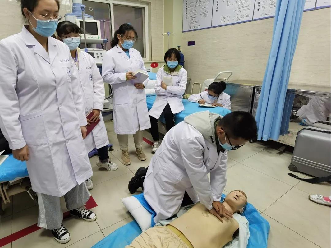 见习期间,医员工们在科室负责医生的指导下,参观学习了急诊科各功能区,了解了急诊科区域设置、人员配置、设备设施及医生排班情况、患者就诊流程等相关知识。在急诊门诊、急诊抢救、急诊病房区域,同学们观摩了急诊科室早交班工作,学习了临床坐诊过程中患者就诊流程及病情诊疗经过。本次见习过程中,带教老师进行了心肺复苏、电除颤操作、监护仪的使用、无菌手套的佩戴等临床技能培训,将理论与实践进行结合,令医员工亲身体验临床一线工作方式,尽早具备临床无菌观念,加深学习印象。